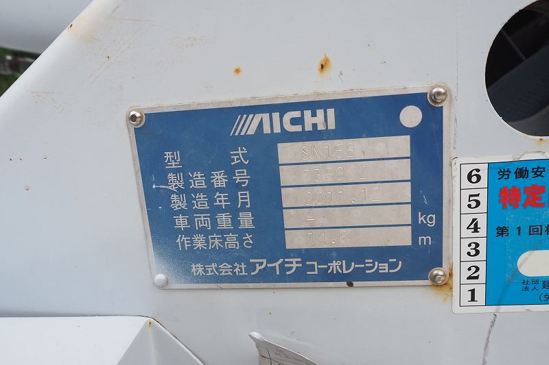 ★アイチ製SN15B ★電工仕様/活線作業車 ★多関節アーム ★第3ブームFRP製(絶縁仕様) ★サブバッテリー式(充電ケーブル接続口:ケーブル欠品のため動作未確認) ★トータルアワメーター 4114hr(点検のため若干変動ございます) ★ユニットアワメーター 1759hr(点検のため若干変動ございます) ★上物 アイチ製 SN15B 作業床高さ14.6m 電工仕様外装AUSY★ブーム自動格納機能 ★バケット昇降式 ★油圧取出ブースターアタッチメント ★油圧式ウインチ・サブブーム ★FRP製バケット 荷重200kg ★収納箱 ★アースリール ★ニュートラル/サイドブレーキ検知インターロック ★坂道発進補助装置