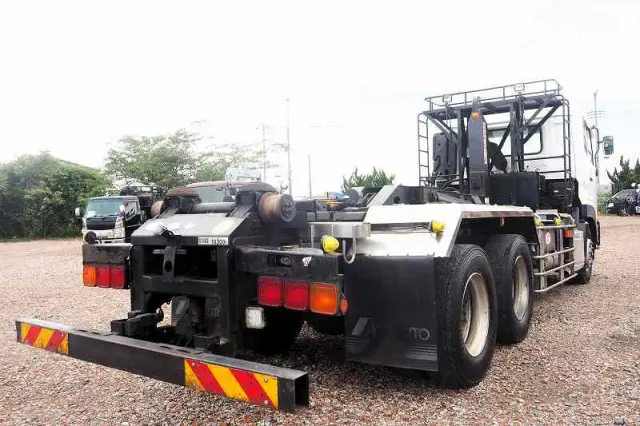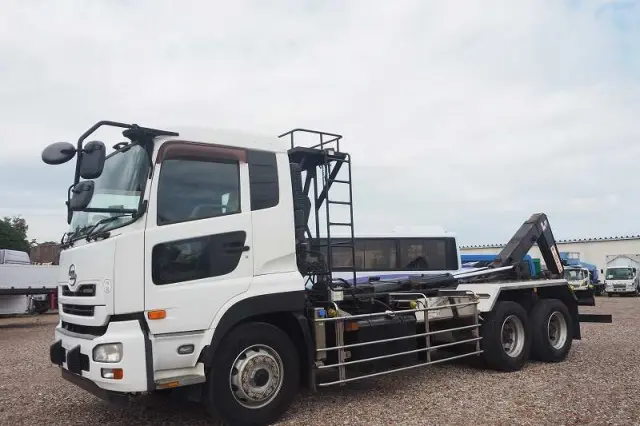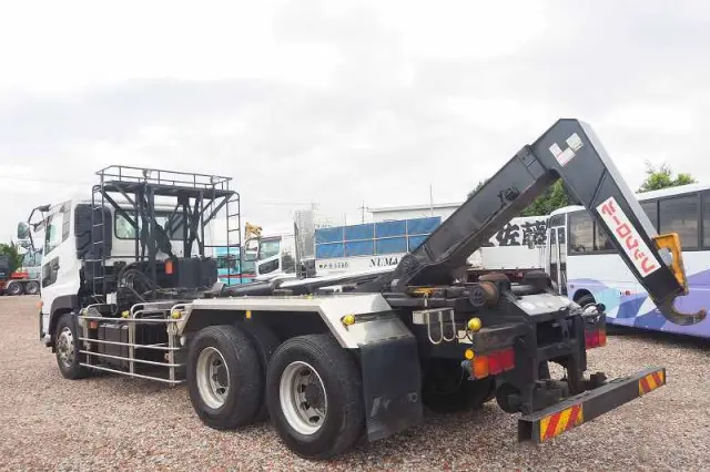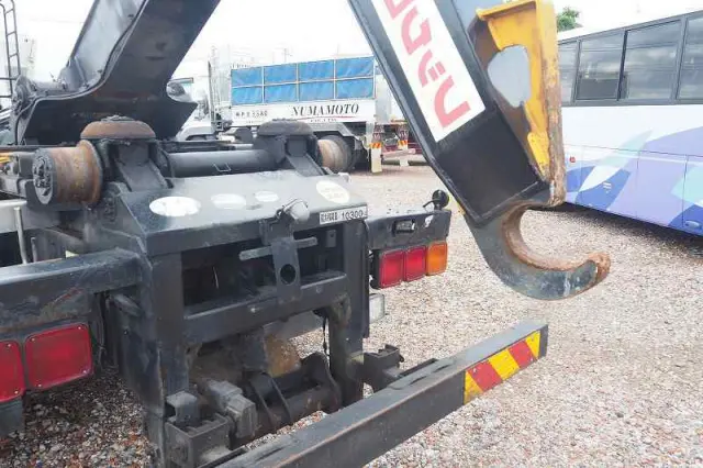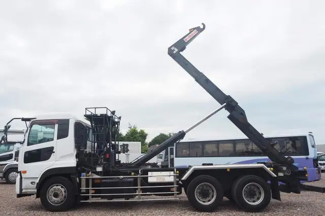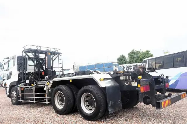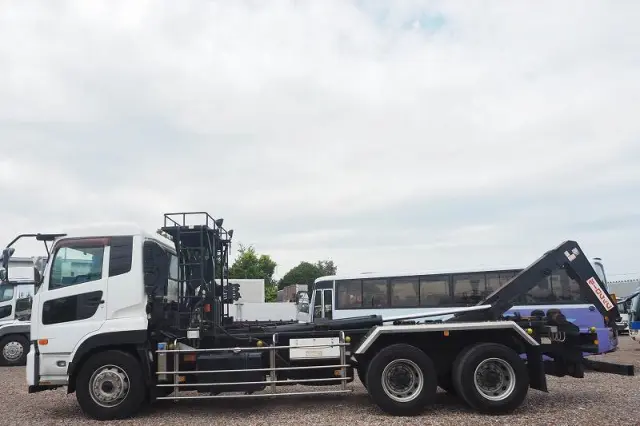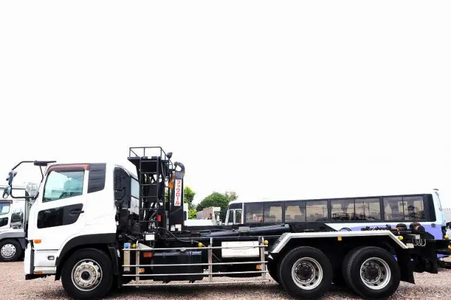 ★2デフ!! ★22tベース!! ★リーフサス ★実走行 ★10830cc(ターボ410馬力) ★2人乗り ★ミッション エスコット(2ペダル) ★ベッド付き ★積載10300kg(抹消前) ★フックロール/アームロール/脱着装置付コンテナ専用車 ★上物 極東開発工業製 JM10-53X ツインホイスト(同年) ★デフロック ★坂道発進補助装置 ★バックモニター外装AUS 下周りS