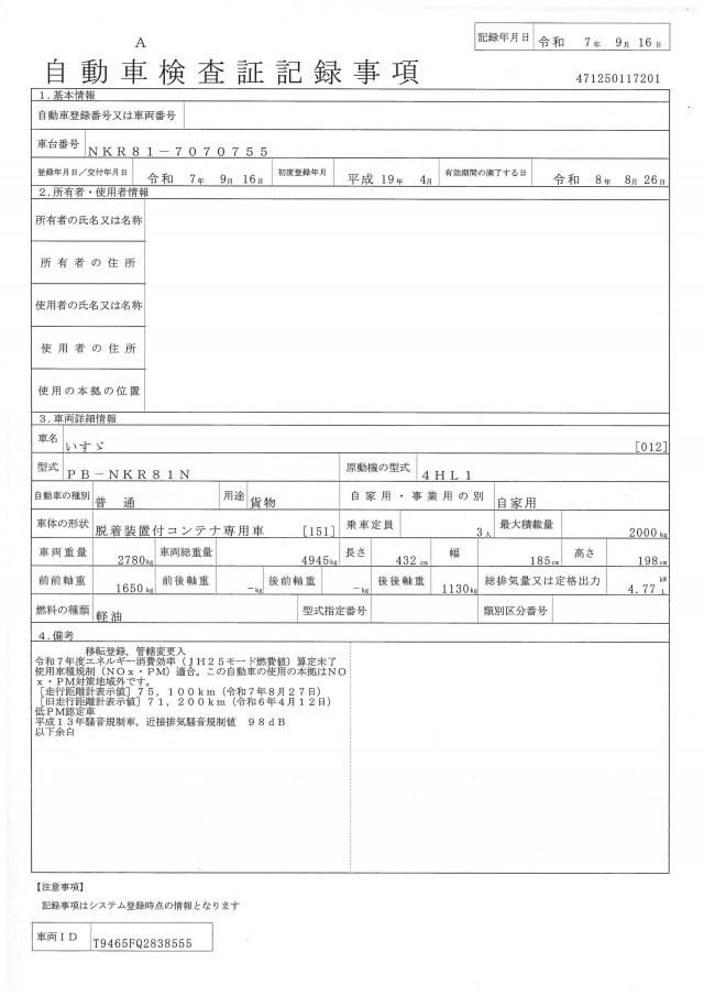型式 | PB-NKR81N | 車台番号下3桁 | 755 |