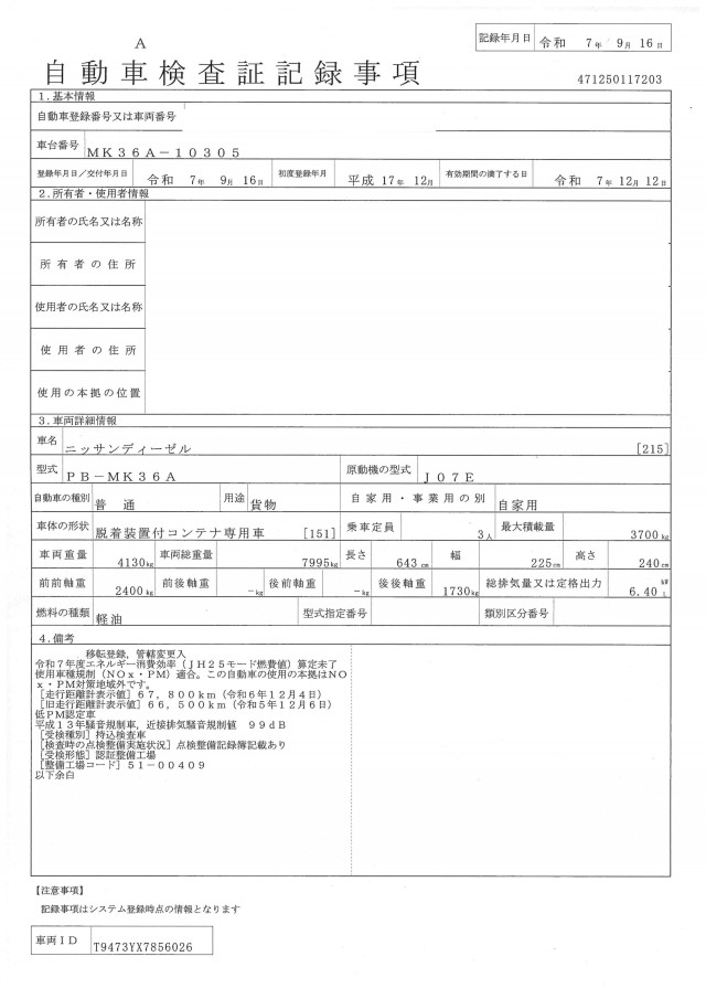 型式 | PB-MK36A | 車台番号下3桁 | 305 |