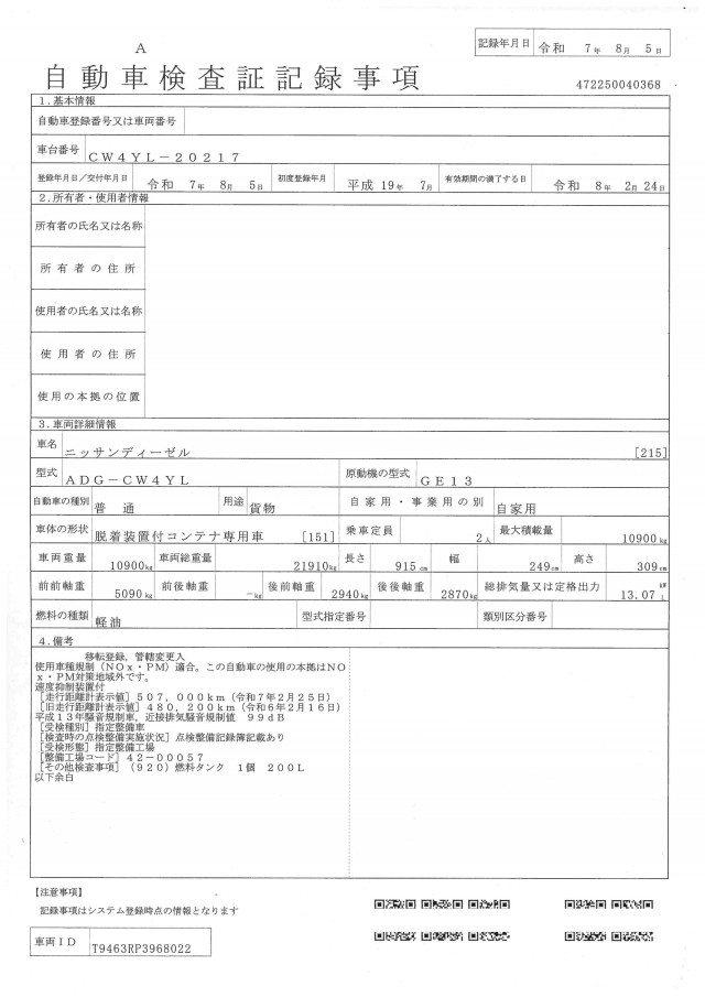 年式 | 平成19年7月 | 走行距離 | 516,850(km) |