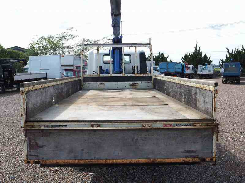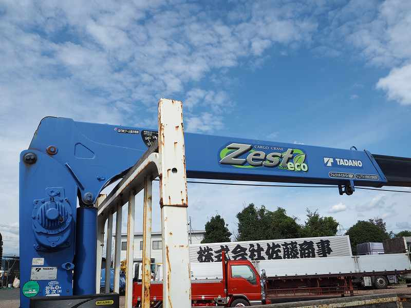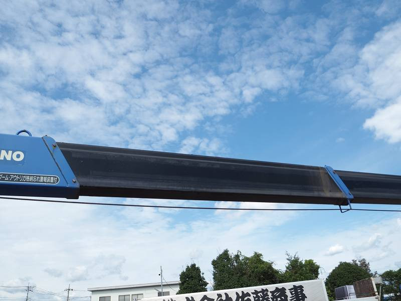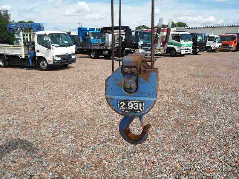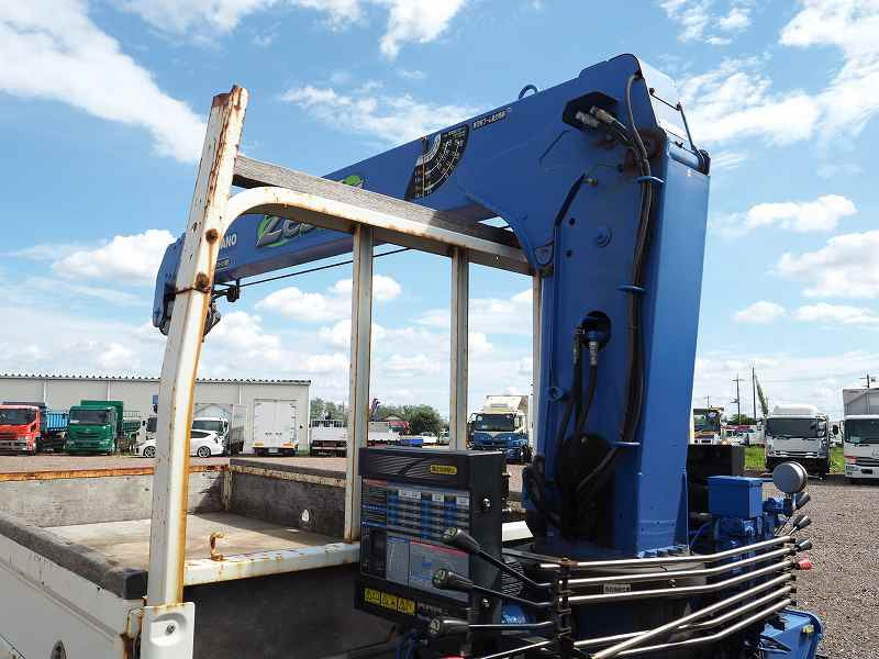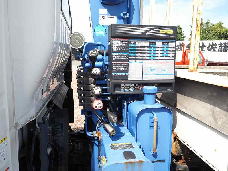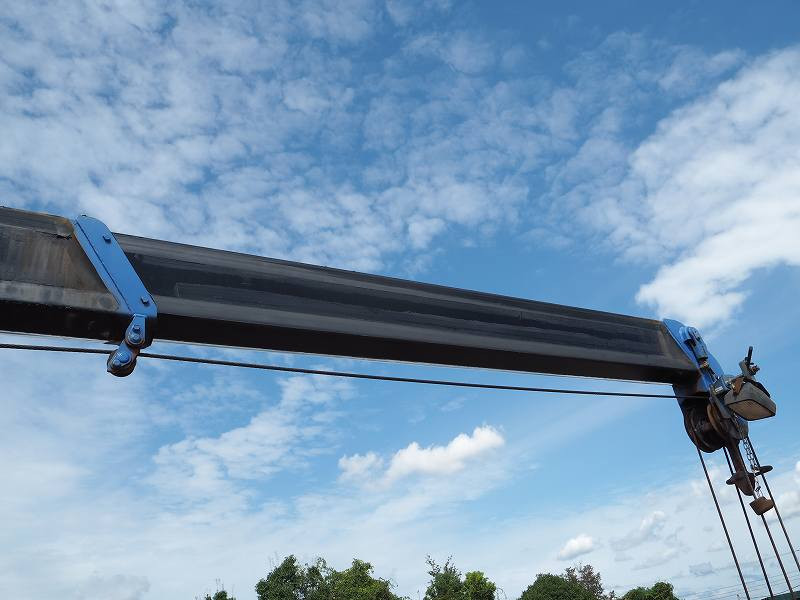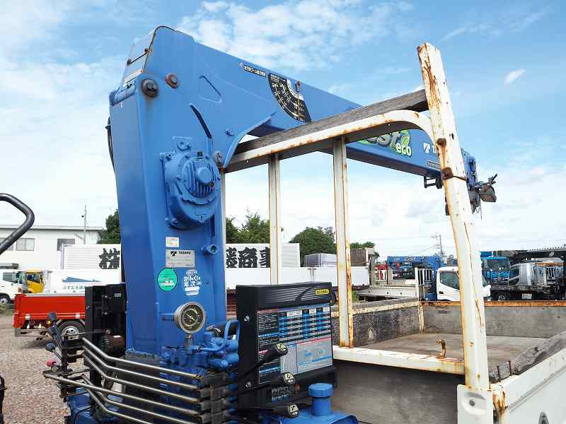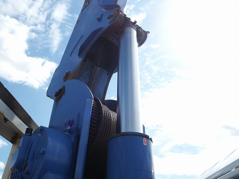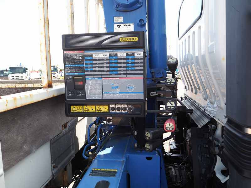 ★4000cc(ターボ150馬力) ★3人乗り ★ミッション 6速マニュアル ★積載3000kg(抹消前) ★ワイドロング ★平ボディ ★三方開 ★上物 タダノ製 TM-ZE294H 4段クレーン フックイン 差し違いアウトリガー 2.93t吊 ラジコン付(2016年7月製:同年) ★荷台内寸(約)長さ371cm×幅208cm ★床面:板張り ★軽々ゲート ★ロープホール外装AUS 下周りS