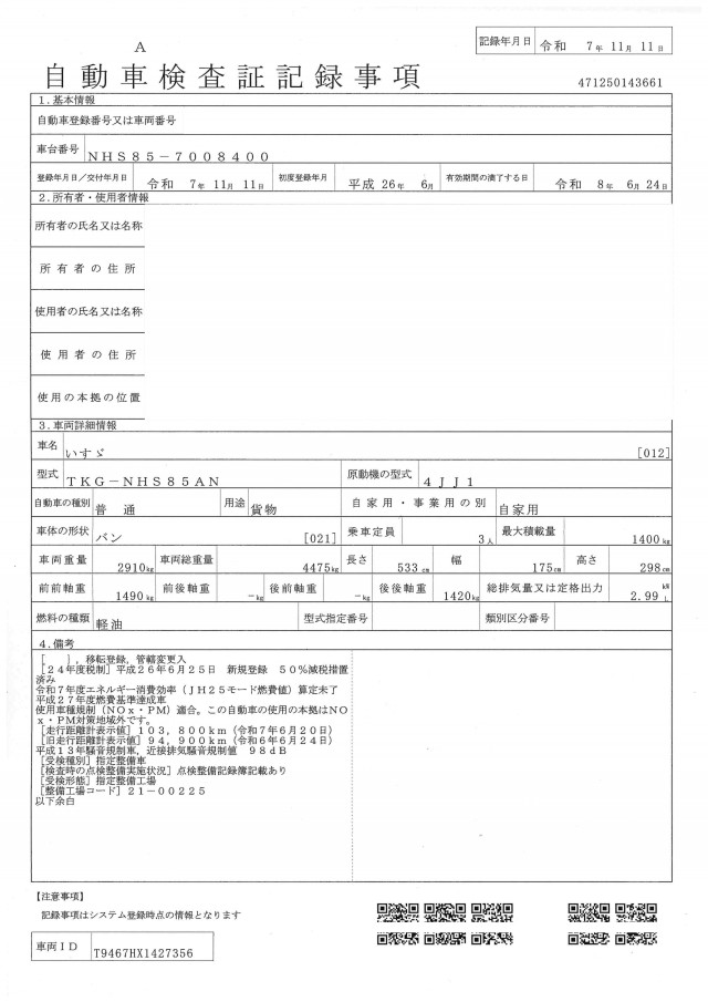 | 型式 | TKG-NHS85AN | 車台番号下3桁 | 400 |