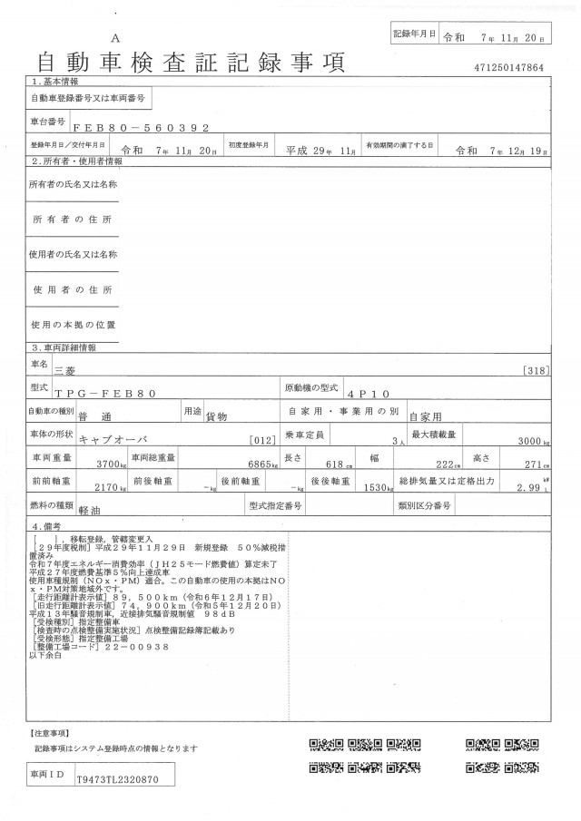 | 型式 | TPG-FEB80 | 車台番号下3桁 | 392 |