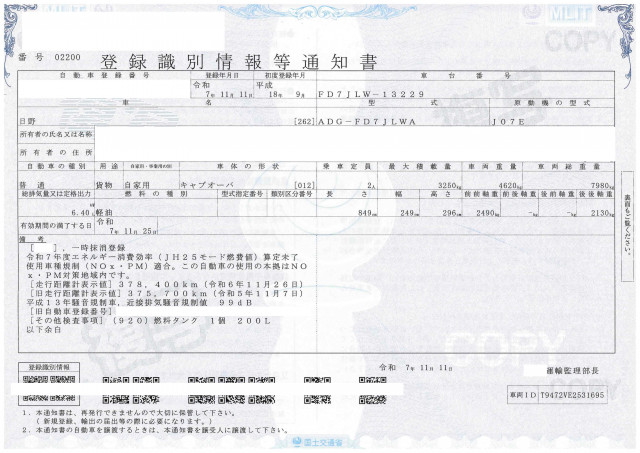 | 型式 | ADG-FD7JLWA | 車台番号下3桁 | 229 |