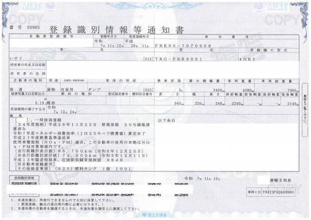 | 型式 | TKG-FRR90S1 | 車台番号下3桁 | 908 |