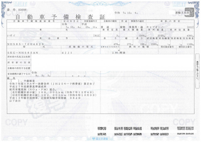 | 車検 | 予備検/2026年3月 | 車輌 | |
