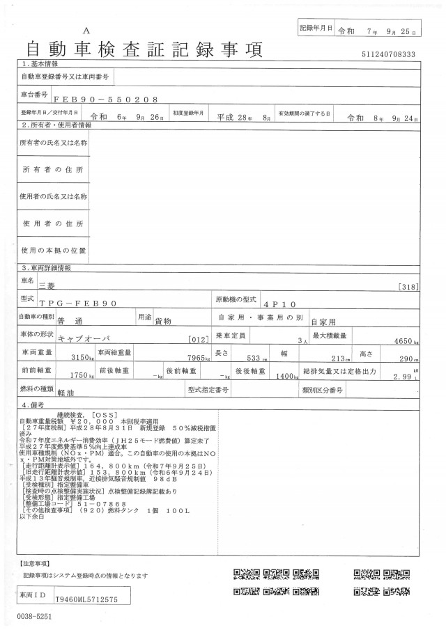 | 型式 | TPG-FEB90 | 車台番号下3桁 | 208 |