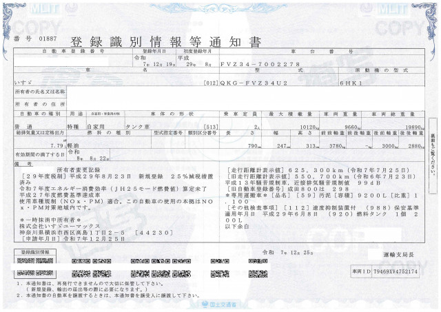| 型式 | QKG-FVZ34U2 | 車台番号下3桁 | 278 |