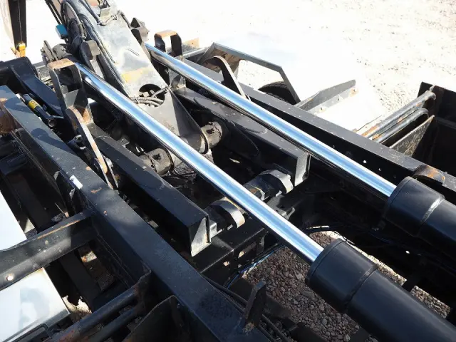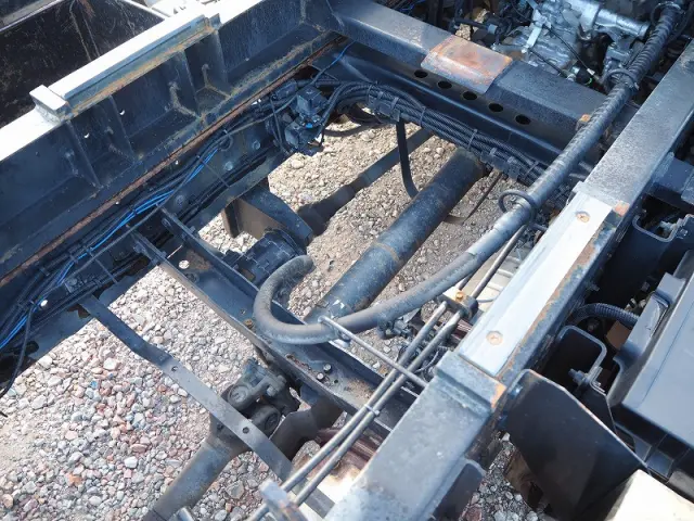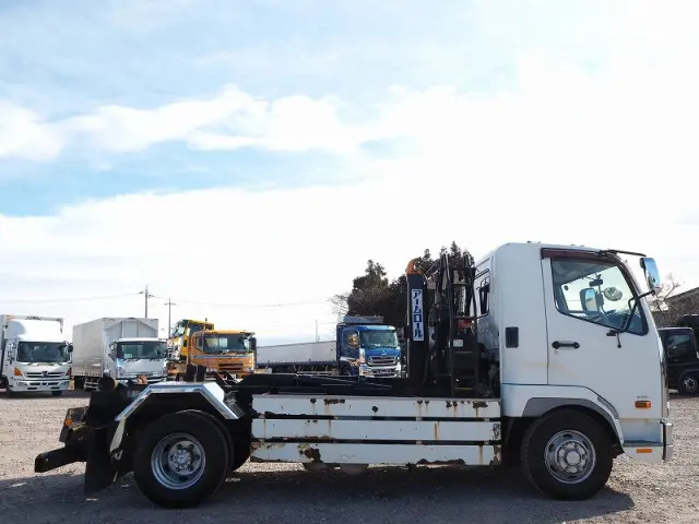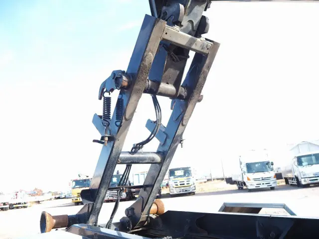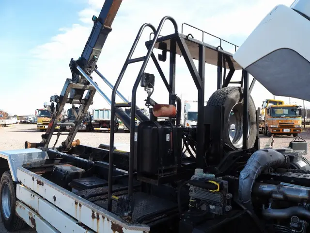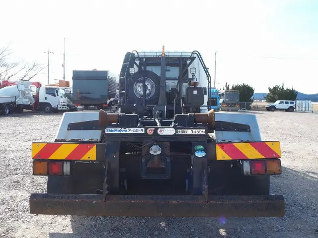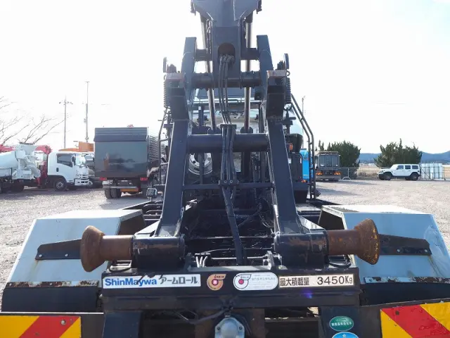 ★7540cc(ターボ220馬力) ★3人乗り ★ミッション 6速マニュアル ★積載3450kg(抹消前) ★アームロール/脱着装置付コンテナ専用車 ★上物 新明和製CCA44-31 ツインホイスト/ダブルシリンダー (同年) ★坂道発進補助装置外装AUS 下周りS
