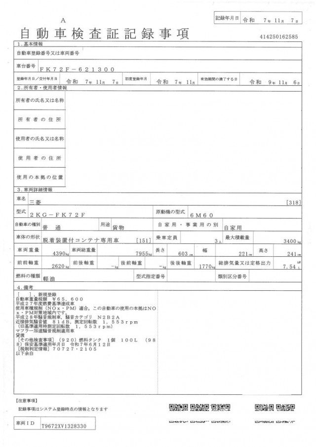 | 型式 | 2KG-FK72F | 車台番号下3桁 | 300 |