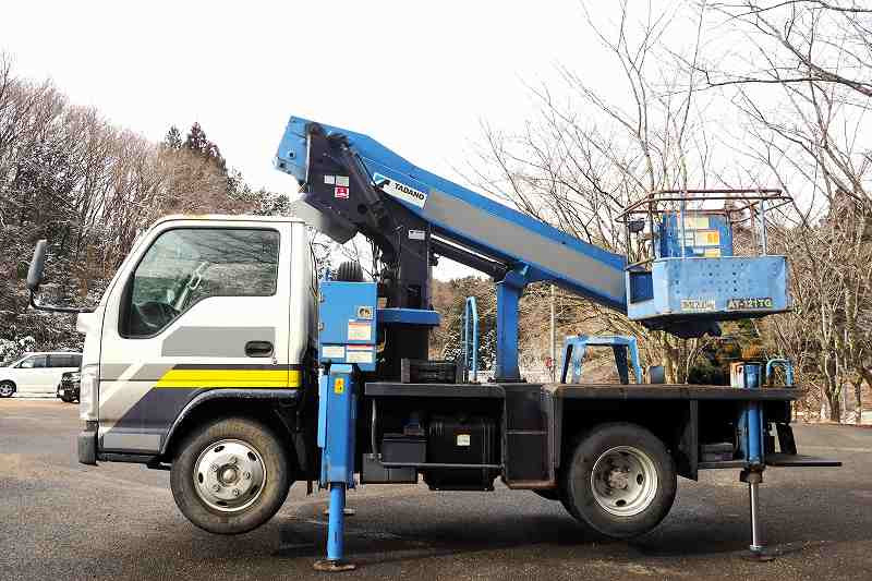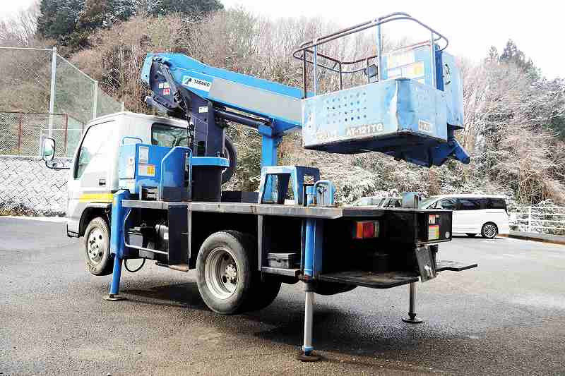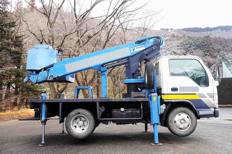 ★2990cc(ターボ150馬力) ★3人乗り ★ミッション 6速マニュアル ★高所作業車 ★アワメーター 4897hr(点検のため、若干変動がある場合がございます) ★上物 タダノ製 スカイボーイ AT-121-2-41003 作業床最大地上高12.0m(2009年9月製:同年) ★ジャッキ自動張出装置 ★ブーム自動格納装置 ★直下型アウトリガー ★バケット積載荷重 200kg外装AUS